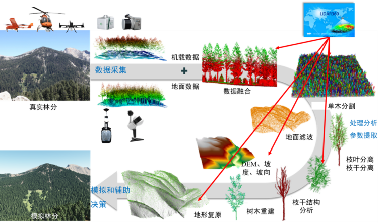 To meet the needs of forest resource inventory, ecological monitoring, and understory environment sensing, the research group conducts studies on multi-platform and multi-scale LiDAR observation and ecological information extraction, and is developing an integrated space–air–ground three-dimensional monitoring system. Relying on airborne, handheld, backpack, vehicle-mounted, and tower-based LiDAR platforms, and integrating multisource data such as optical remote sensing, UAV LiDAR, and ground-based mobile measurements, the group focuses on high-precision 3D reconstruction, retrieval of vegetation structural parameters, and intelligent interpretation of ecological variables in complex environments. These efforts aim to establish full-scale sensing and analytical capabilities spanning from broad ecological patterns to fine-scale vegetation structure.